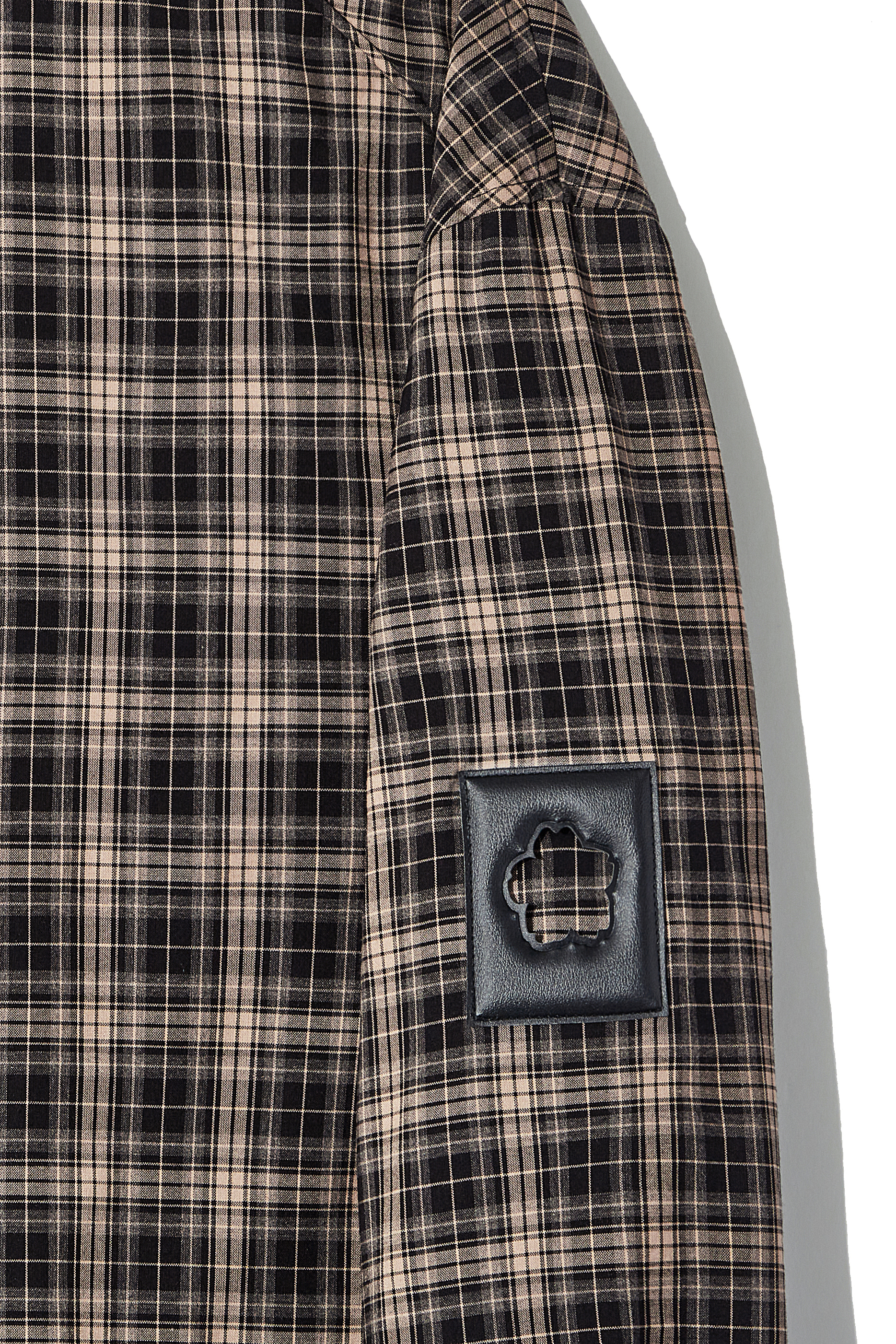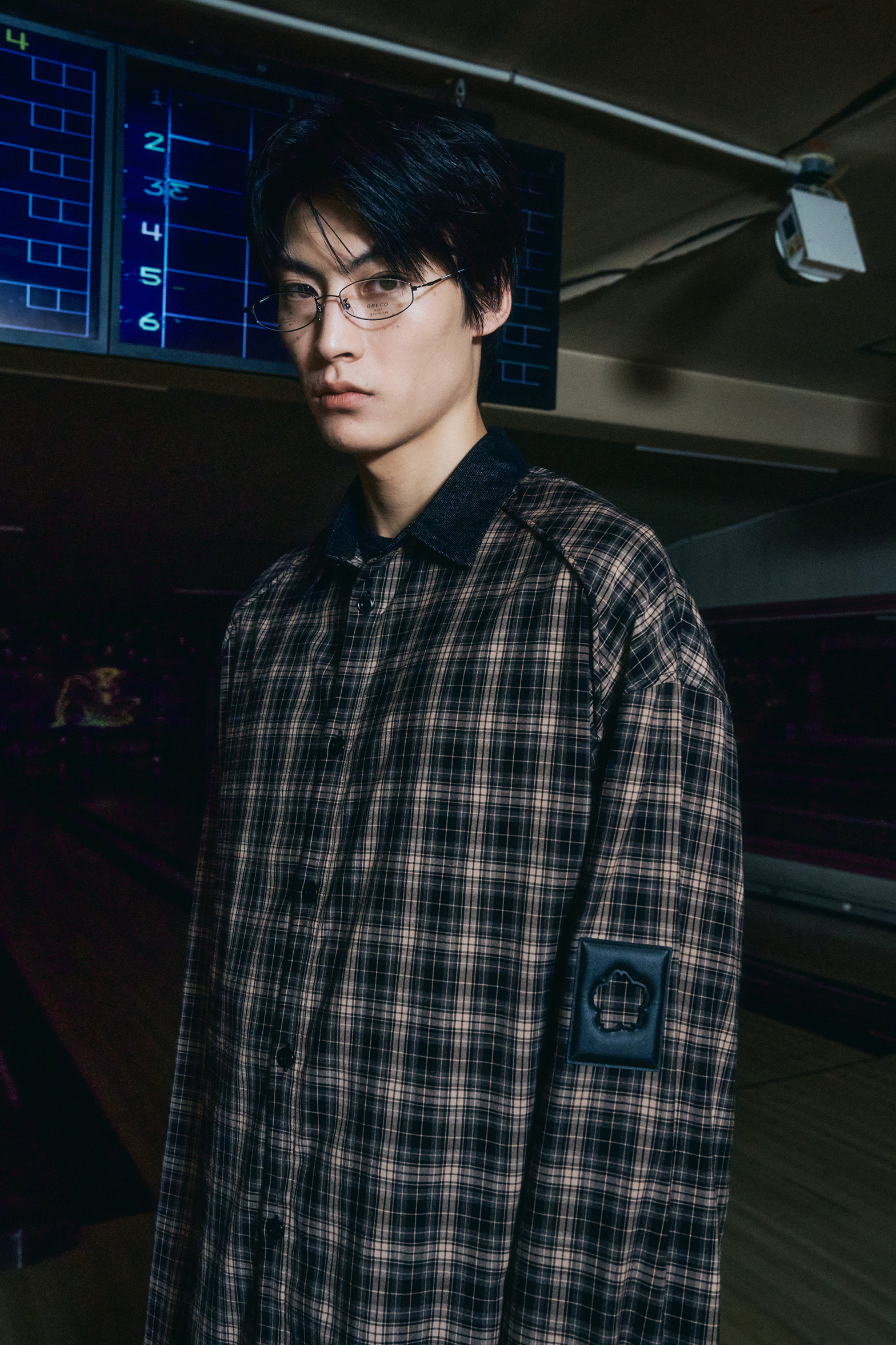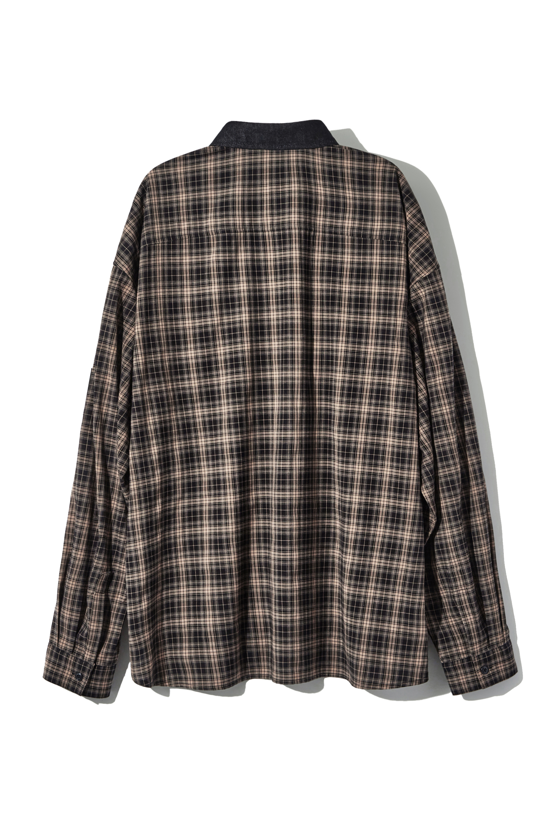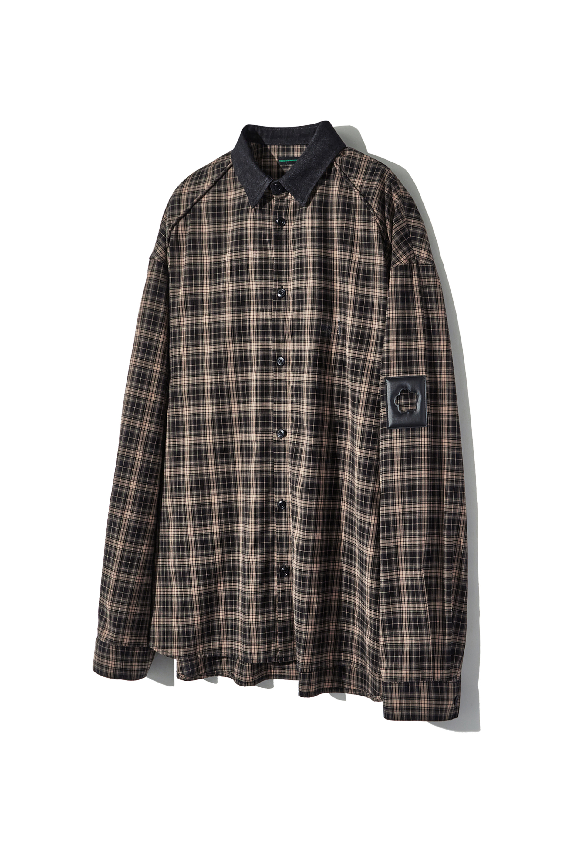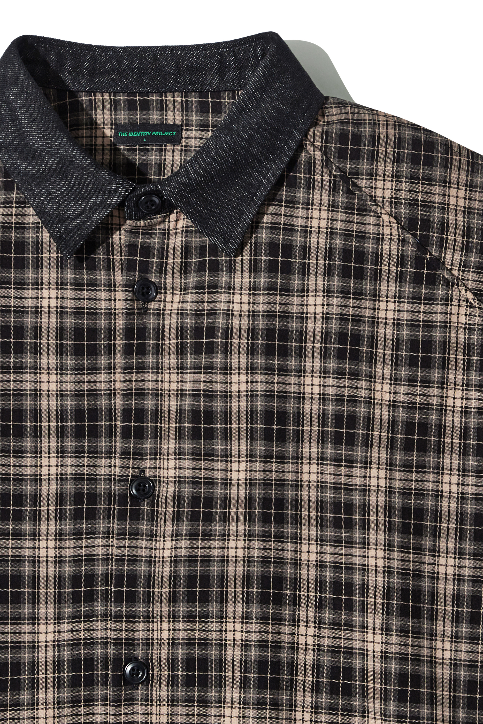 - 데님 카라와 체크 소재를 활용한 패치워크 디자인